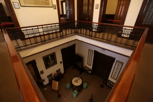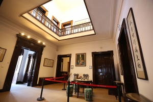 梁启超旧居共有两幢小楼,门牌号分别是民族路44号、46号。44号,位于北侧,建于1914年,是一幢意式建筑。46号是梁启超的书房,即“饮冰室”,由意大利建筑师白罗尼奥设计,造型别致典雅,为浅灰色两层洋楼。首层为书房,二楼做卧室和会客,楼前设有花坛。“饮冰”二字,语出《庄子·人世间》:“今吾朝受命而夕饮冰”,梁启超用此表达其对国家、民族命运的忧虑与焦灼。台湾诗人余光中留下墨宝:“其室名冰,其人犹热”。