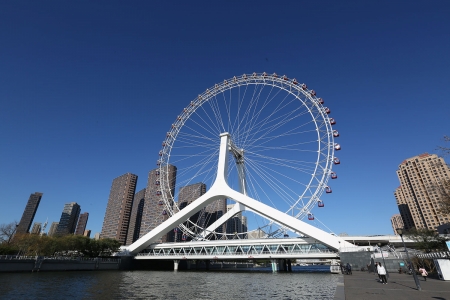 全称天津永乐桥摩天轮,位于天津市三岔河口区域,大悲院前,永乐桥上。不仅是世界上唯一建在桥上的摩天轮,还是世界上唯一一座具有观光和通行“双功能”的桥。直径110米,轮外装挂48个360度透明座舱,每个座舱可乘坐8个人,可同时供384个人观光。摩天轮旋转一周所需时间为28分钟,到达最高处时,周边景色一览无余,甚至能看到方圆40公里以内的景致,正可谓“水天相接360度,凌空凝望九河汇聚”。