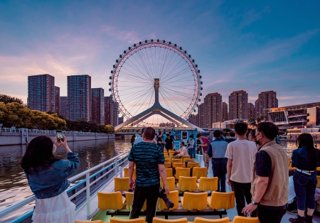 白天游船,三岔河口,尽显繁华与喧闹;永乐桥上,天津之眼凌空转动;狮子林桥,石狮静静守护着来往的行人和车辆。夜幕降临,华灯初上,乘船沿海河漫溯,看见津湾广场高楼林立,灯光璀璨,意式风情区风情万种,人来人往;海河之上,多少桥?“一桥一品格,一桥一风景”;“天津之眼”摩天巨轮灯火辉煌……迷人的夜景,让人心生无限感慨。“船在水中行、人在画中游”的美妙意境,不亚于泛舟游览巴黎赛纳河畔的感受。(部分内容来源于网络,如有侵权,请联系注明出处。)